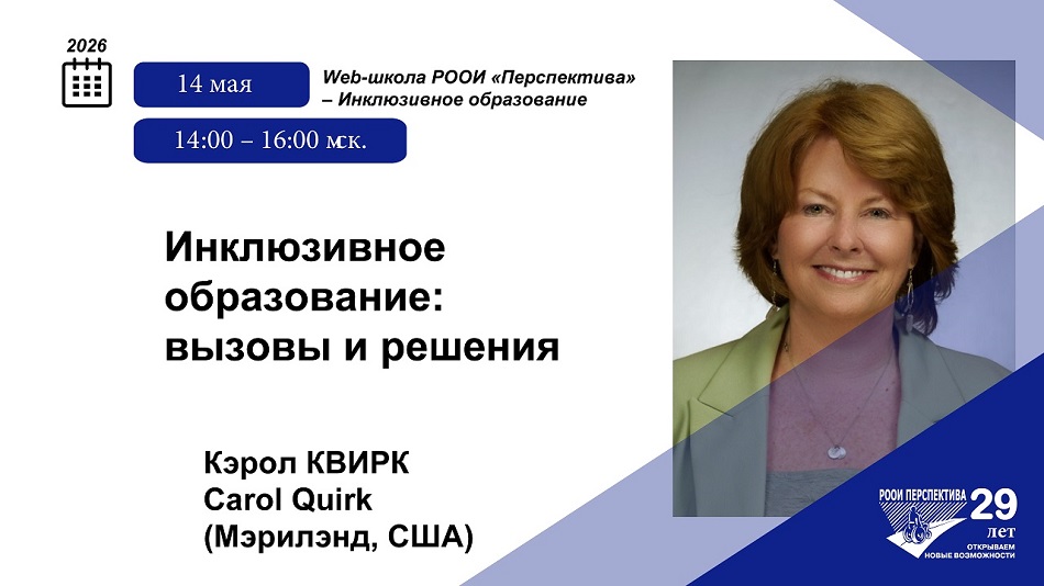14 мая эксперт в области обучения специалистов инклюзивных школ, доктор наук Кэрол Квирк, проведёт для российских педагогов обучающий вебинар на тему: «Инклюзивное образование: вызовы и решения».