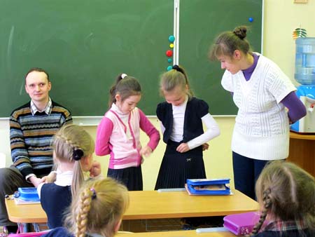 …Ощупывая тростью ступеньки, Александр Зайкин поднимается на второй этаж, где гостей с нетерпением ждет 2 «А». Александру помогает ориентироваться Юлия Кулешова, у которой в связи с неврологическим заболеванием есть некоторые особенности в речи и в мелкой моторике. О своей инвалидности ведущие урока рассказывают детям без тени смущения, объясняя, что проблема не в их нарушениях, а в отношении окружающих и в окружающей среде, которая все еще очень плохо приспособлена для свободной жизнедеятельности людей с особенностями.