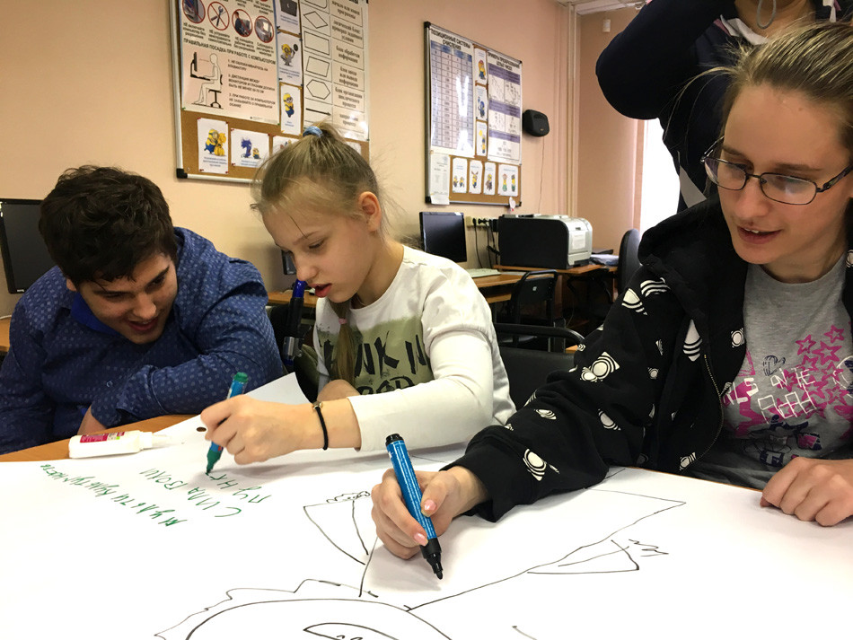 Вначале сотрудницы РООИ «Перспектива» познакомили ребят с организацией, с «лидерским» направлением, рассказали про лагеря, где подростки с инвалидностью учатся писать пьесы и играть на сцене, и проект «Театральная Перспектива». После ребята обсудили, кто такой лидер, какими качествами он должен обладать. Эти вопросы вызвали бурную дискуссию, участники тренинга активно высказывали свое мнение.
