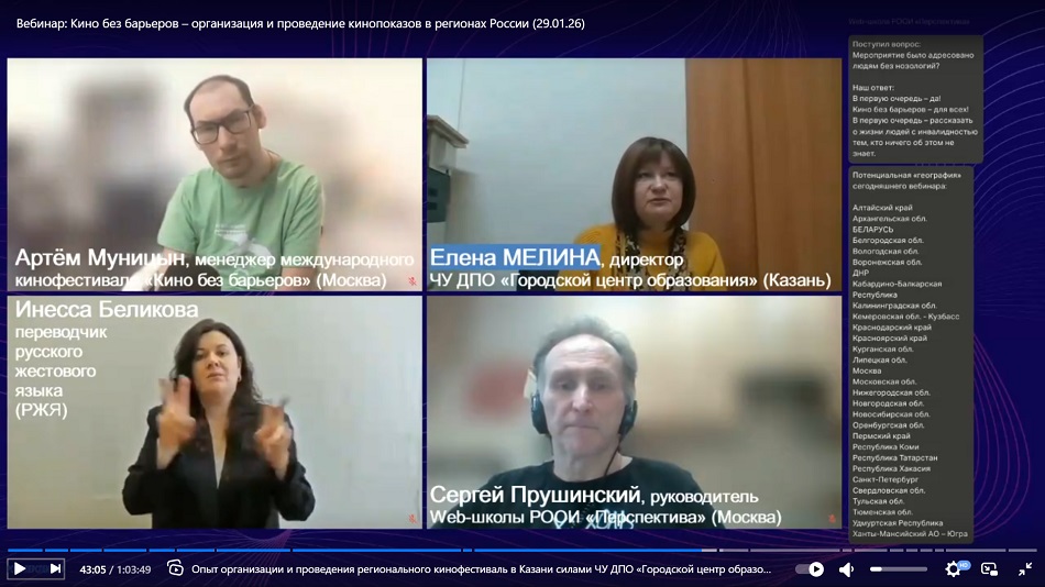 Очень ценным и живым моментом вебинара стал рассказ Елены Мелиной, директора Частного учреждения дополнительного профессионального образования «Городской центр образования» (Казань), которая на практике организовала «Эхо кинофестиваля «Кино без барьеров» в Казани в 2025 году. Её опыт – настоящая методичка для новичков.