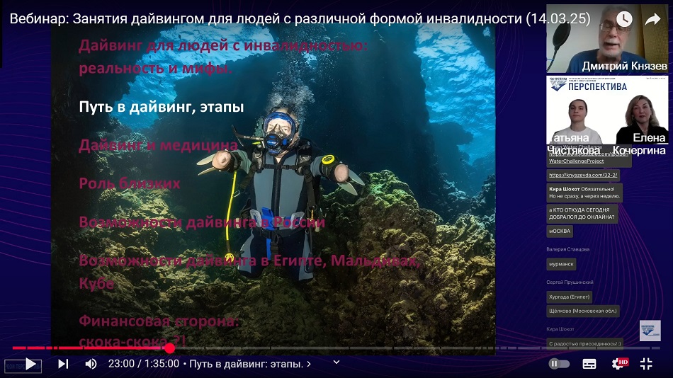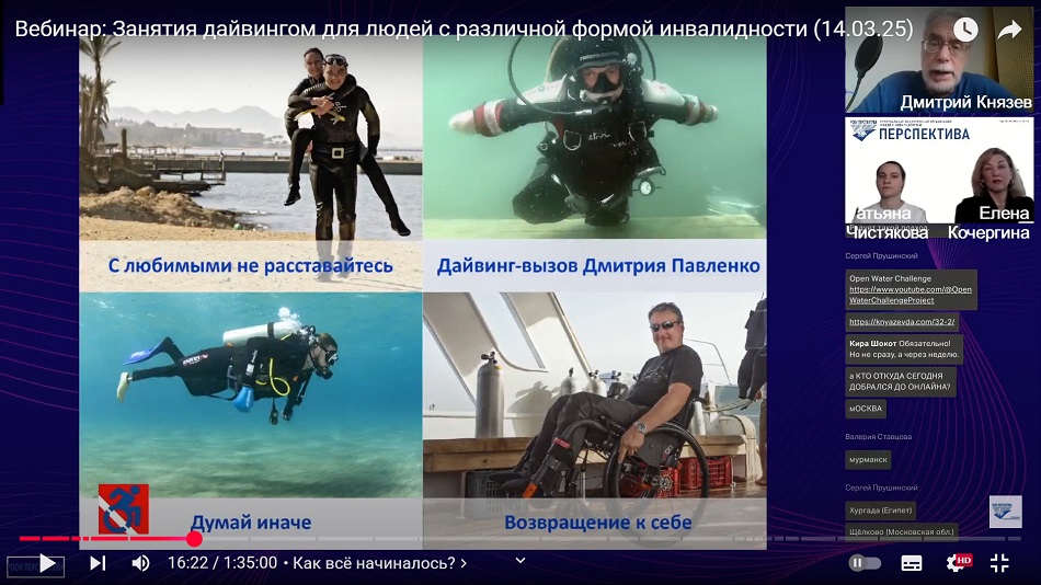 «Очень мотивирующий и вдохновляющий состоялся вебинар! Дмитрий и Елена подробно рассказали про возможности заниматься дайвингом для людей с инвалидностью, поделились, мотивирующими историями дайверов с инвалидностью, рассказали про программы и дайвинг-центры, которые есть в России и других странах, принимающие людей с инвалидностью для совершения погружения. Также мы поговорили о том, как дайвинг помогает в социализации молодых людей с инвалидностью.
