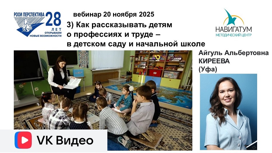 Как помочь детям сориентироваться в огромном и постоянно меняющемся мире профессий? И как сделать знакомство ребёнка с миром профессий не просто интересным, но и по-настоящему полезным? Этим вопросам был посвящён вебинар 20 ноября с профориентологом Айгуль Киреевой – руководителем Методического центра Навигатум и научным сотрудником в АНО «Центр научных исследований в сфере профориентации и психологии труда».
