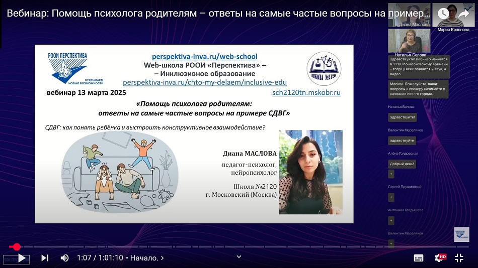 Вебинар завершился ответами на вопросы слушателей, включая обсуждение различий между СДВГ и ОВЗ, а также важность диалога между родителями и школой.