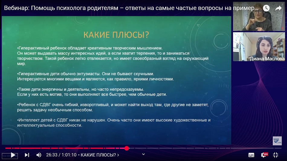 Педагог-психолог Диана Маслова, подробно разобрала компоненты СДВГ: дефицит внимания, гиперактивность и импульсивность. Были рассмотрены причины возникновения синдрома, включая генетические, неврологические факторы и влияние окружающей среды. Особый акцент сделан на том, что СДВГ — это не просто поведенческая проблема, а особенность работы мозга, требующая особого подхода в обучении и воспитании.