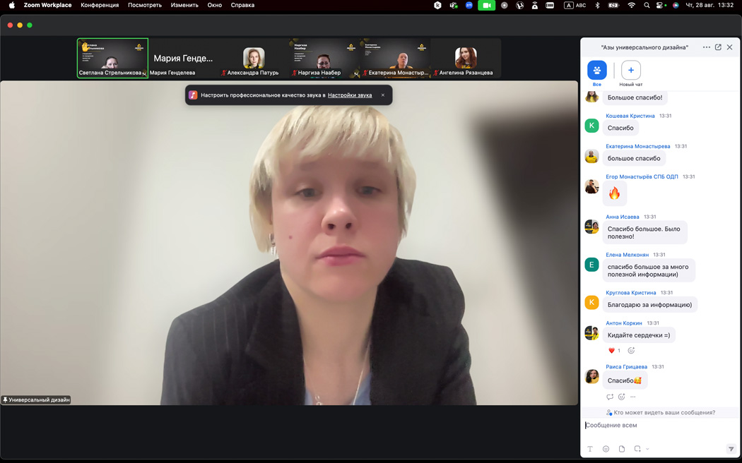 28 августа отдел универсального дизайна РООИ «Перспектива»: руководитель отдела Мария Генделева, менеджер проектов Наталья Мазунина, а также специалисты Анна Жукова и Софья Алейникова провели вебинар для сотрудников сети магазинов для строительства, ремонта и обустройства дома «Лемана ПРО».