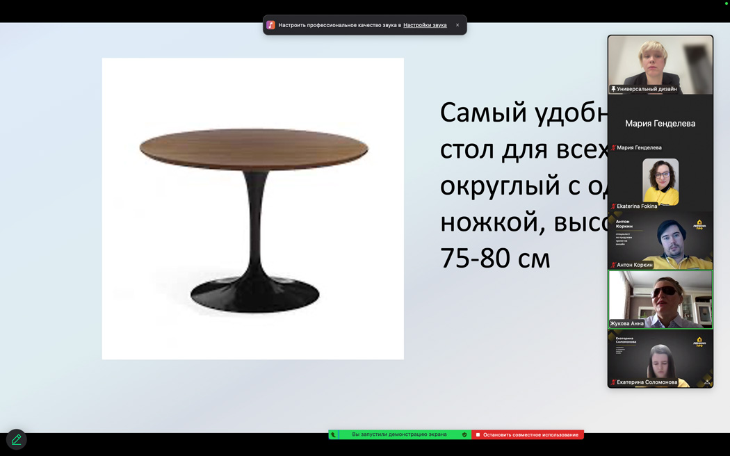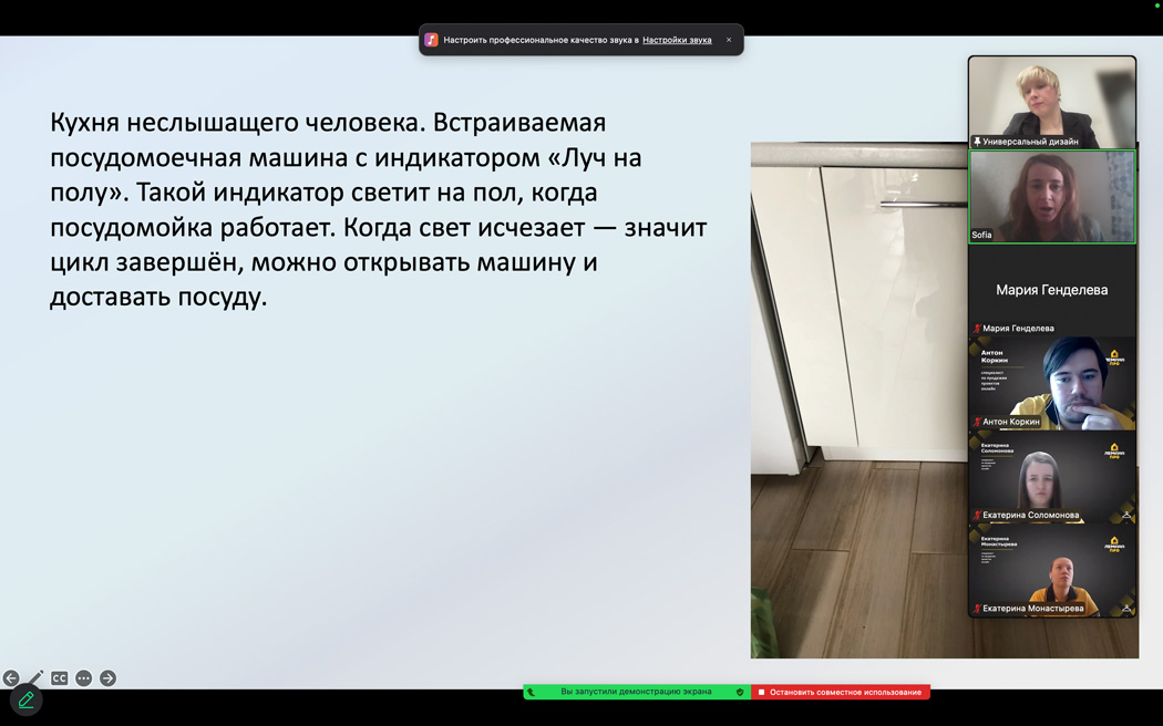 Мероприятие прошло в онлайн-формате и состояло из двух частей: теории и практики. В теоретической части Мария представила присутствующим статистику и обоснование инклюзии в нашем обществе, а также дала определение и обозначила принципы универсального дизайна. Затем каждый из сотрудников отдела универсального дизайна поделился своими рекомендациями и примерами комфортного пребывания в своих домах/квартирах вне зависимости от особенностей: Мария и Наталья рассказали о «фишках» квартир для людей на колясках, Анна описала идеальную квартиру незрячего/слабовидящего человека, Софья – пользователя неслышащего/слабослышащего. Были разобраны подробно зоны кухни, ванной и туалета, а также гостиной, гардеробной.