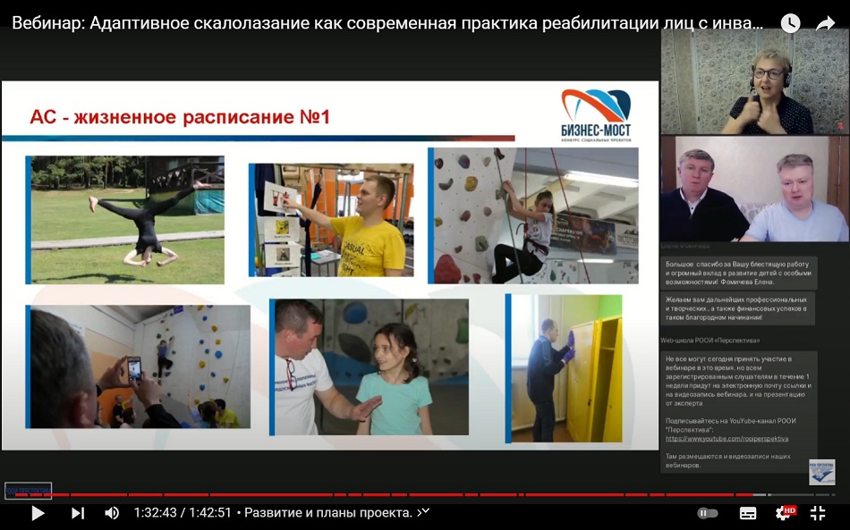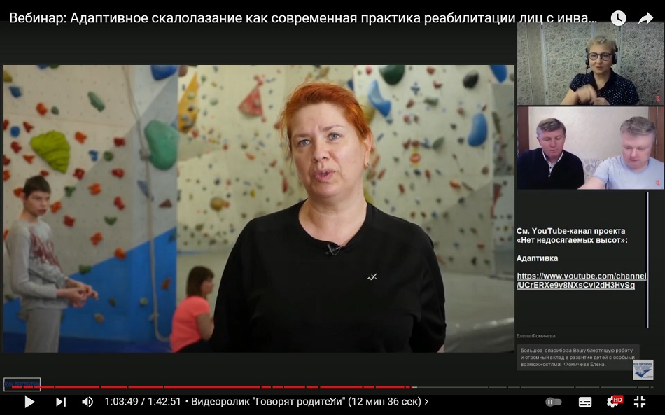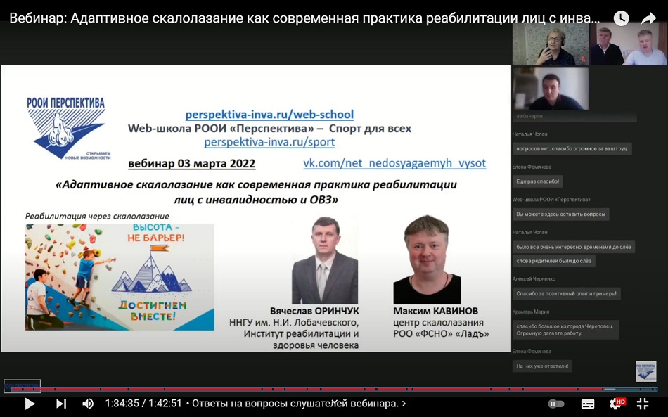 Вебинар 3 марта был посвящён проекту «Нет недосягаемых высот», где главную роль играют дети и подростки с инвалидностью. На примере адаптивного скалолазания руководитель спортивного клуба Максим Кавинов (центр скалолазания РОО «ФСНО» «Ладъ») и доцент кафедры адаптивной физической культуры Вячеслав Оринчук (Нижегородский государственный университет им. Н.И. Лобачевского) рассказали о том, как важно заниматься спортом, выходить в общество, и быть понятыми наравне со всеми.