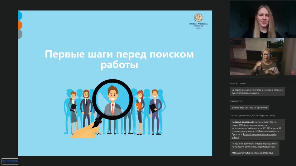 Команда HR-специалистов «БАТ Россия» (British American Tobacco Russia) на вебинаре 22 мая рассказала, как человеку с инвалидностью успешно пройти интервью и получить работу мечты. Специалисты отдела трудоустройства часто сталкиваются с соискателями, которые не знают куда и кем пойти работать. На вебинаре эксперты рассказали, как ответить для себя самого на этот вопрос, а также в каком направлении двигаться и развиваться, как проложить правильно свой профессиональный путь.