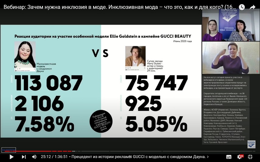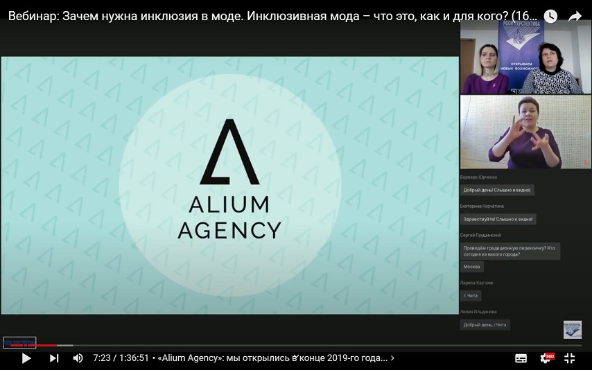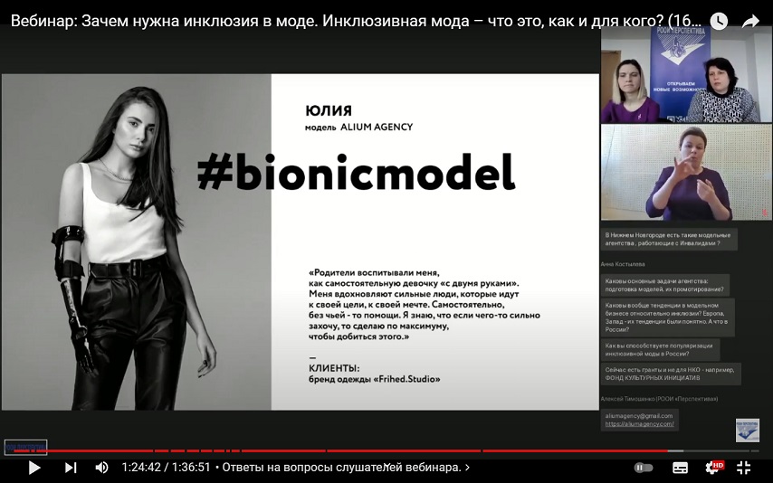 На вебинаре слушатели активно задавали вопросы, проявляли большой интерес к теме инклюзии в моде, и есть понимание, что деятельность инклюзивного модельного агентства «Alium Agency» очень востребована – у многих людей с инвалидностью появилась возможность обрести большую уверенность в себе и стать профессиональными моделями».
