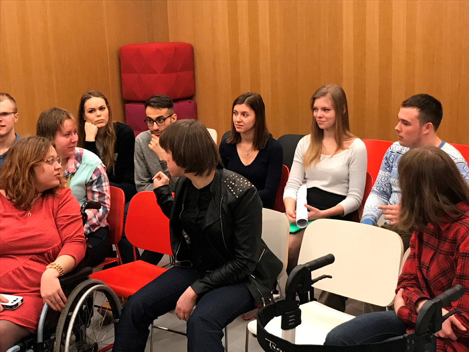 «Лидеры», молодые люди с инвалидностью, рассказали студентам архитектурного факультета МГСУ о себе и о трудностях, с которыми они сталкиваются в городской среде. Будущие архитекторы узнали о таких проблемах, как плохая доступность московского метро, недостаточное количество грамотной навигации и контрастных световых ориентиров в городе, плохое качество дорог, тактильных плиток, бордюрного камня. «Лидеры» также обратили внимание на трудности взаимодействия и общения между людьми с инвалидностью и без инвалидности.