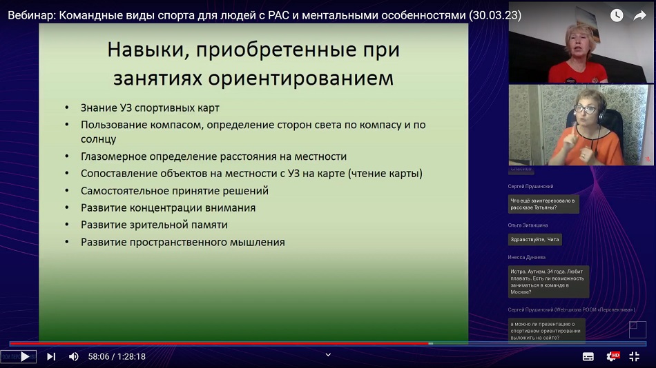 Материал, представленный на вебинаре специалистами проекта «Особый спорт», актуален для всех, работающих в области адаптивного спорта и адаптивной физической культуры, и сам по себе интересен – как для общего развития, так и для профессиональной работы. Спортивное ориентирование можно применять как в качестве отдельной тренировки в адаптивном спорте, так и как один из методов рекреации. Элементы волейбола, легкой атлетики и чирлидинга можно использовать как в разминке перед тренировкой, так и в качестве самого тренировочного процесса».