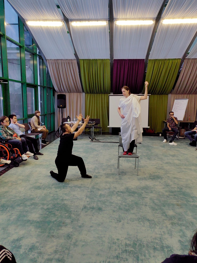 Однако программа лагеря оказалась гораздо шире, чем просто работа в двух группах. Организаторы выстроили насыщенный график встреч с мастерами, чтобы показать многогранность театрального мира. Например, актриса Анастасия Рысева посвятила занятие борьбе с внутренними зажимами, а известные по киноработам Софья Лебедева и Даниил Чванов поделились секретами базовой актерской техники. Оперная певица Елена Мартиросова привнесла в лагерь дыхание большой сцены, а актер Артём Григорьев на собственном примере показал, как физическая подготовка становится фундаментом для перевоплощения.