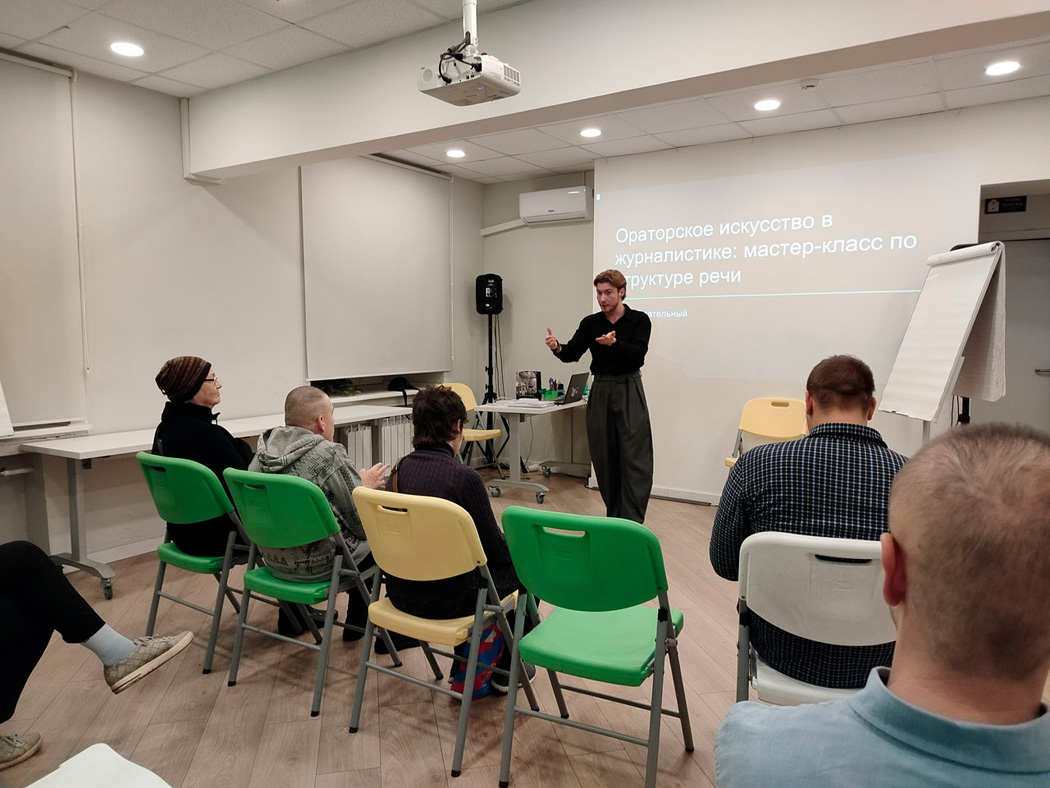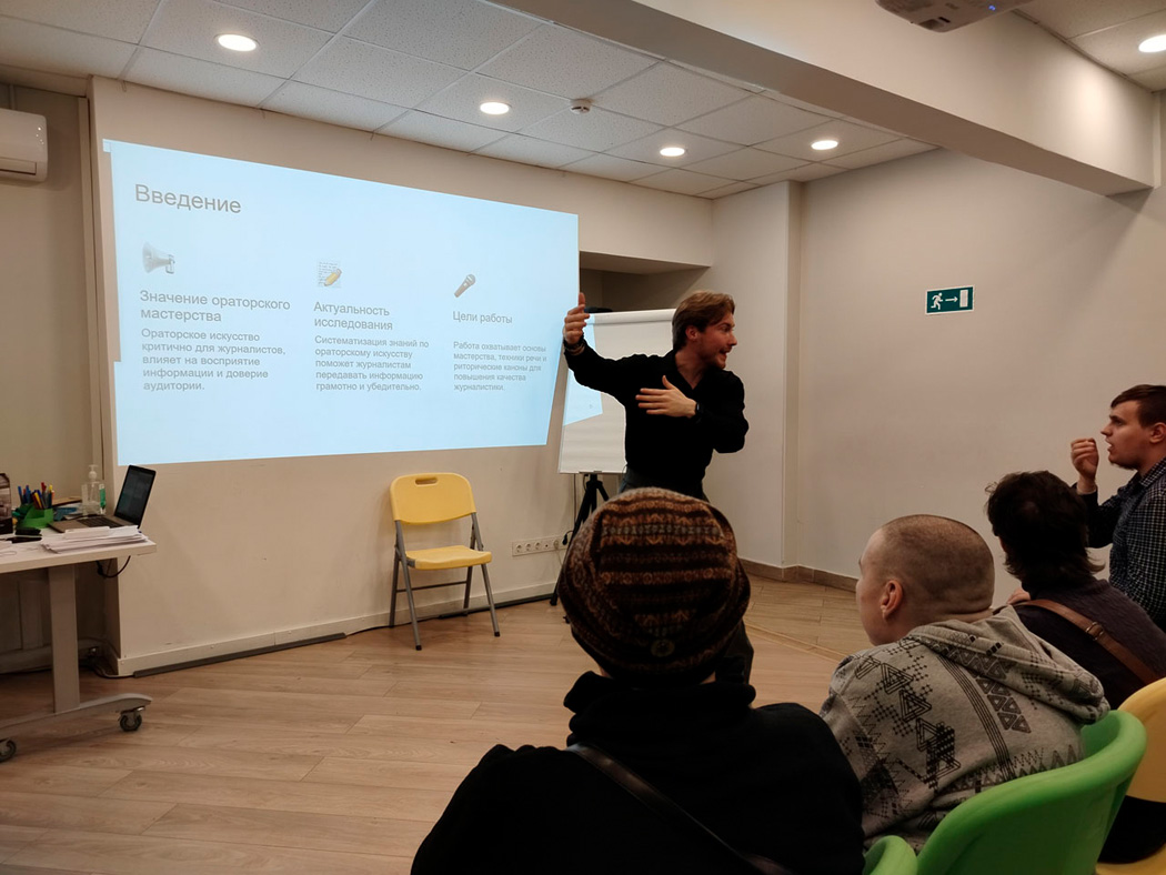 21 октября в офисе РООИ «Перспектива» состоялся тренинг по ораторскому искусству «Введение в структуру речи в журналистике». Его провёл член Союза журналистов Москвы, редактор Информационного агентства «Федеральная служба новостей» Артём Смирнов.