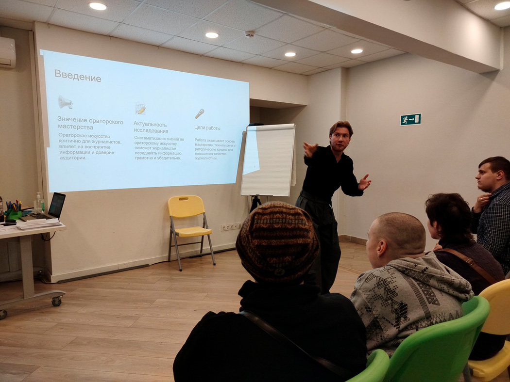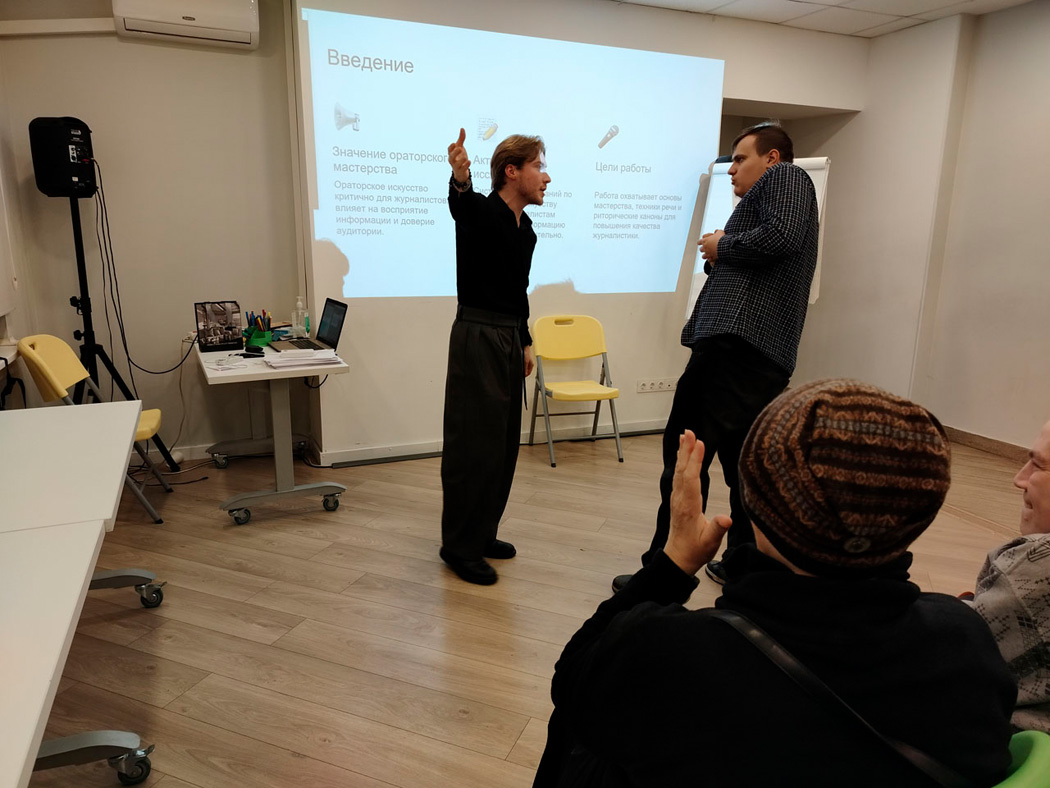 21 октября в офисе РООИ «Перспектива» состоялся тренинг по ораторскому искусству «Введение в структуру речи в журналистике». Его провёл член Союза журналистов Москвы, редактор Информационного агентства «Федеральная служба новостей» Артём Смирнов.