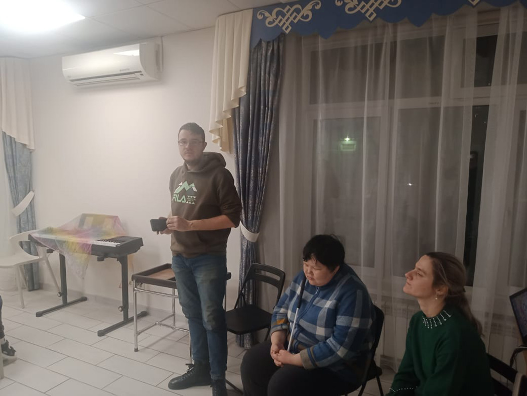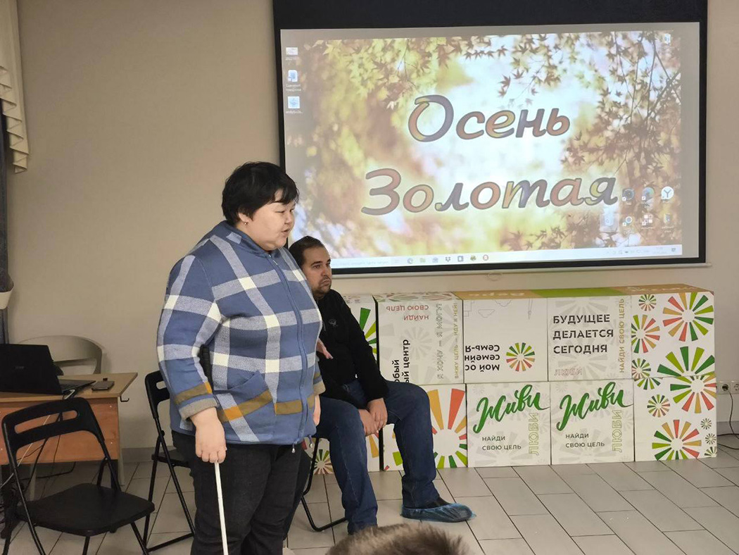 Встречу открыла Джамиля Смакова. Она — специалист отдела инклюзивного образования организации. Джамиля рассказала, что в рамках своей работы приезжает в общеобразовательные школы города Москвы и проводит «Уроки доброты», на которых рассказывает о жизни людей с инвалидностью, этикете общения и взаимодействия с ними. Такие занятия помогают разрушить многие стереотипы и создать возможности для лёгкого и свободного общения школьников с инвалидностью и без. Девушка также поделилась, что занимается волонтёрством, играет в народном театре «Внутреннее зрение» и поёт в ансамбле «Зеленоградские сударушки».