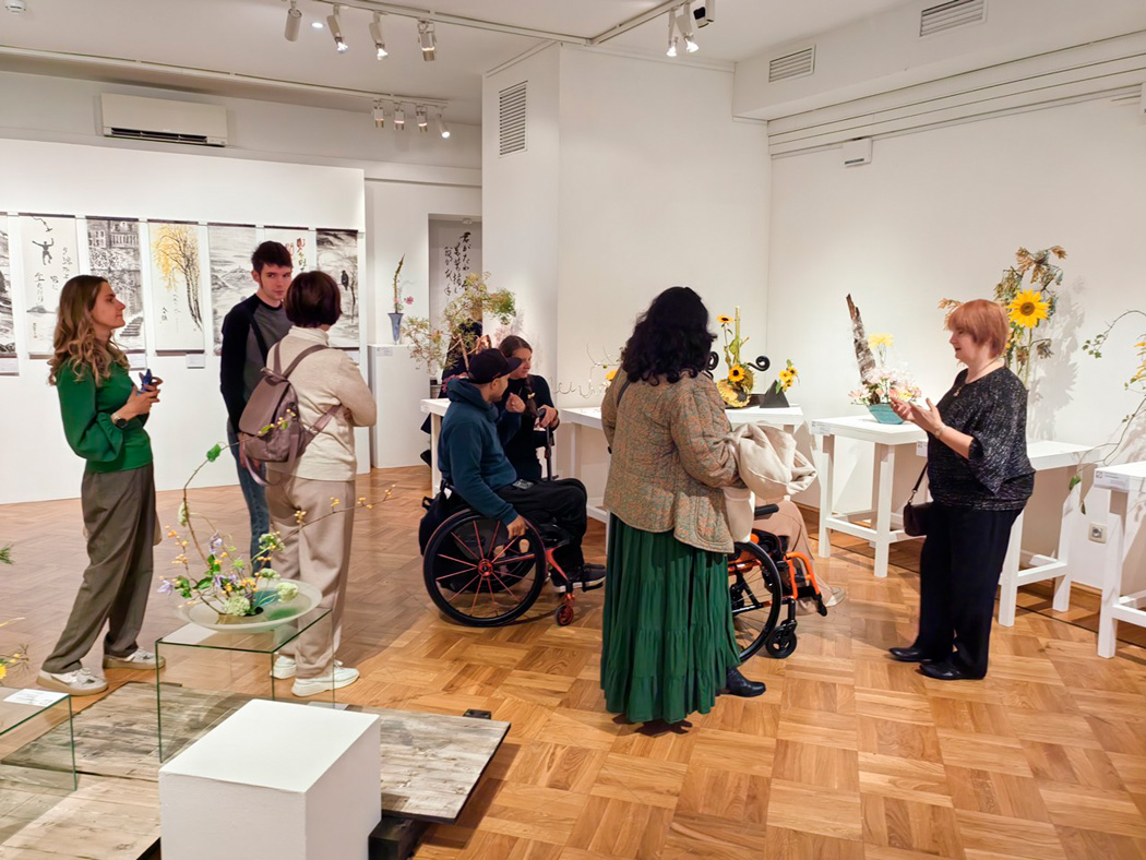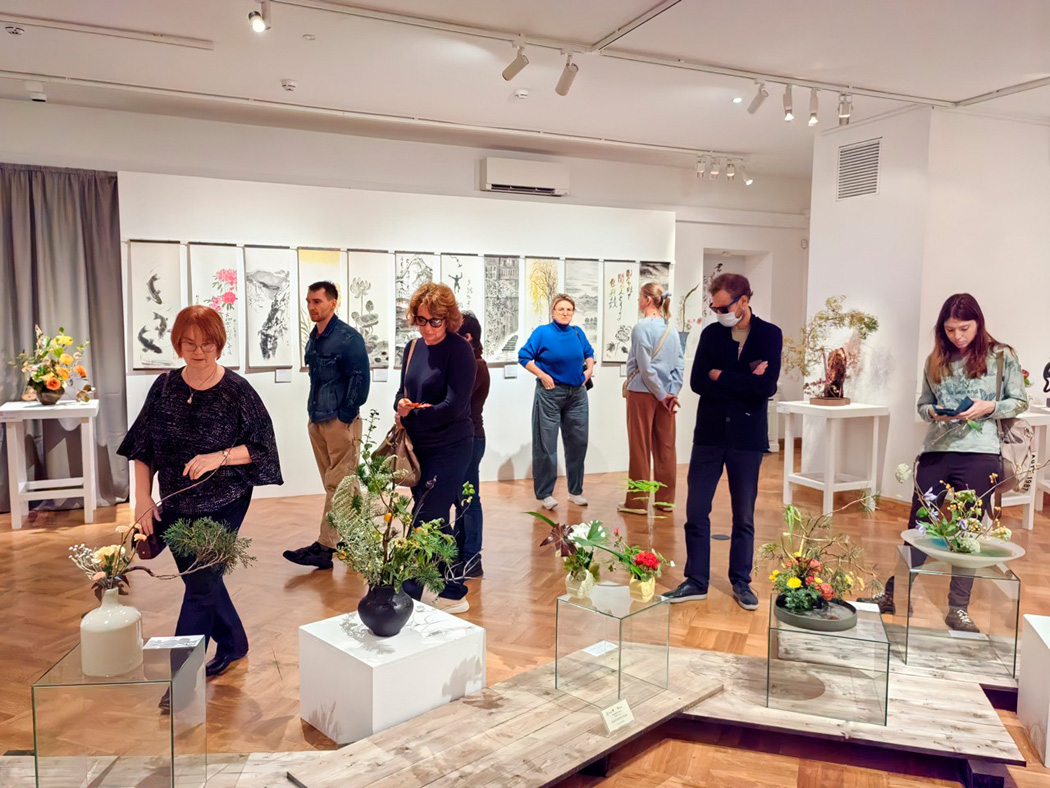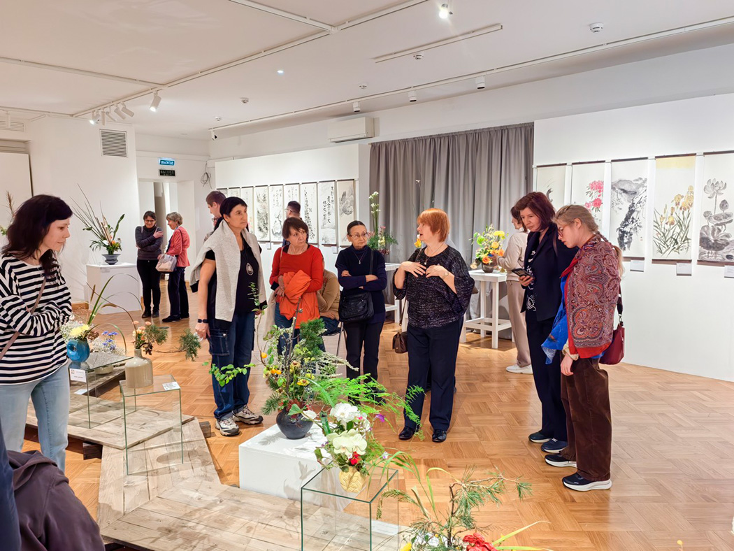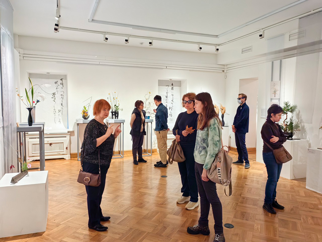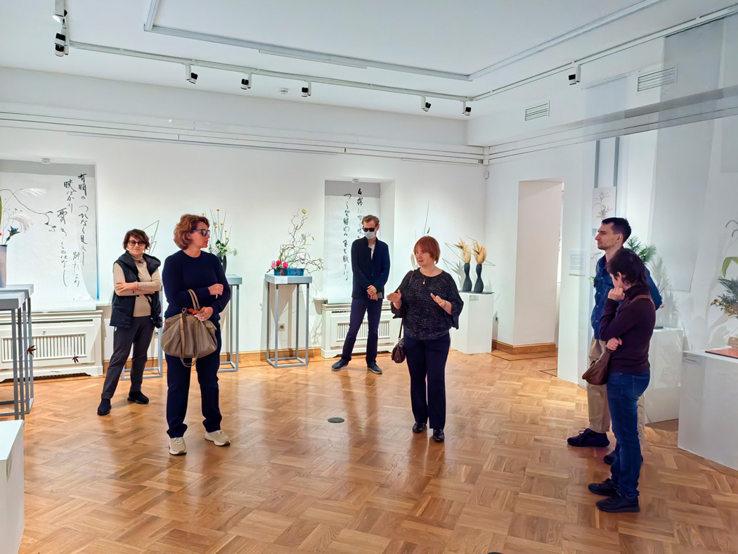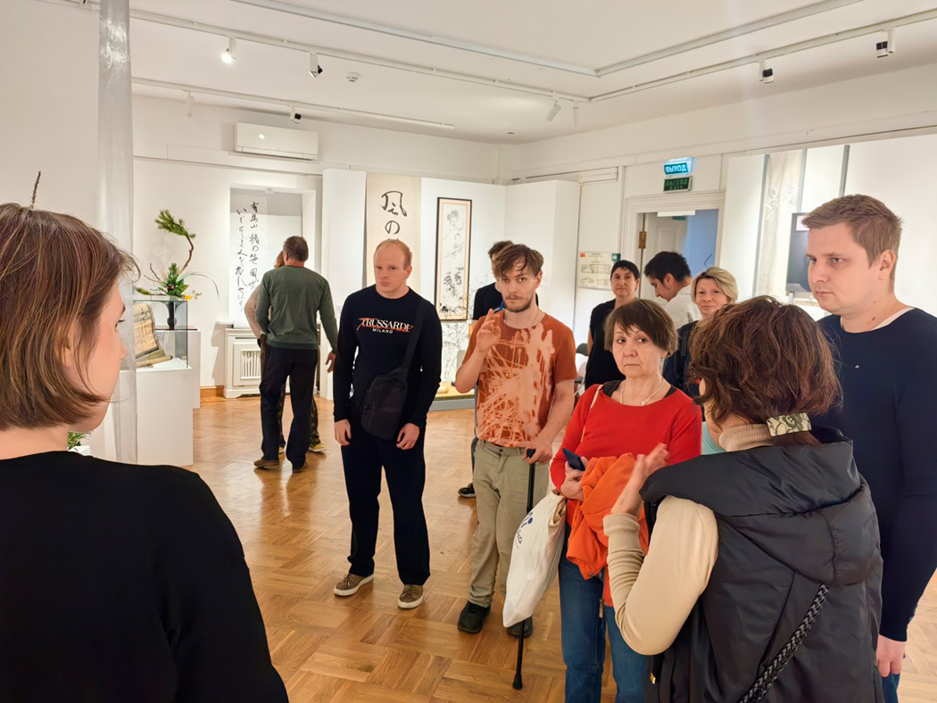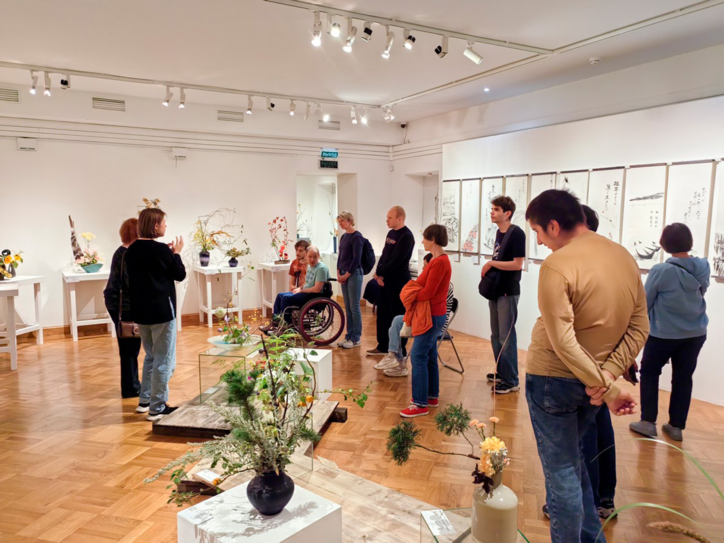 Экскурсия познакомила участников с традиционным японским искусством через работы учеников известного мастера Ямада Мидори. На выставке можно было увидеть, как идеи ветра и эха находят отражение в цветочных композициях, живописи и керамике.