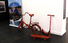 Еще одна интересная деталь композиции – это скейтборд, велосипед, самокат и коляска для человека с инвалидностью. Этот небольшой «транспортный парк» стал настоящим арт-объектом: он выкрашен в солнечный ярко-оранжевый цвет, символ равенства – как людей, так и их транспортных средств. Здесь нет запретов, каждый желающий может на любом из них совершить пару кругов по вестибюлю ЦДХ.