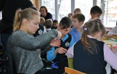 В рамках открытия фотовыставки сотрудники РООИ «Перспектива» Алексей Фокин, Нурсина Галиева, Наталья Нижник, Карина Андрейчук и Анна Мыльникова организовали пять станций для мастер-классов. Ребята сложили паззл «Доступный город», познакомились с основами жестовой азбуки, раскрасили и наклеили на «плакат дружбы» бумажных человечков с инвалидностью и без, смастерили красивые сувениры своими руками из бумажных тарелок и цветной бумаги.