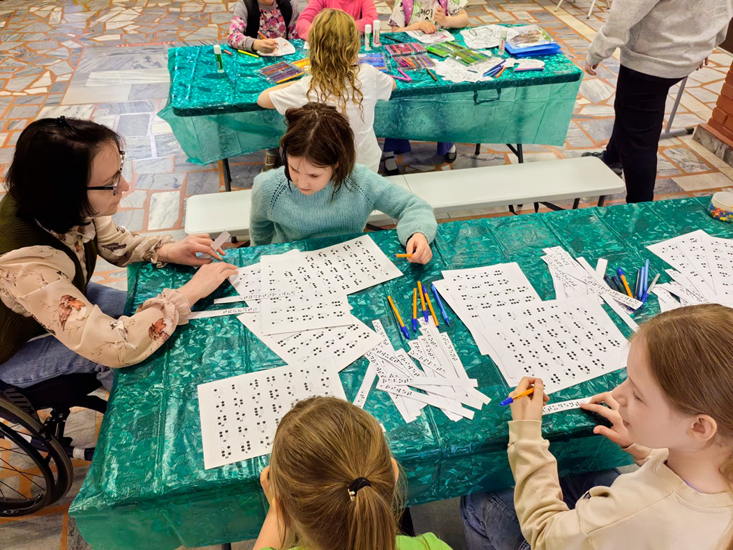 Ребята с увлечением расшифровывали ребусы, написанные рельефно-точечным шрифтом. Ведущая знакомила участников с удивительной историей создания азбуки, рассказала о Луи Брайле и первых инструментах для письма, которые кардинально изменили жизнь незрячих людей.