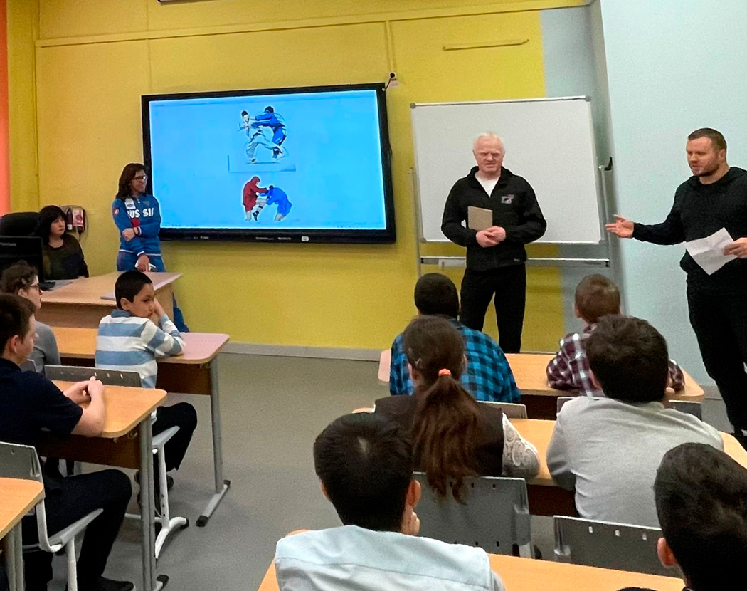День параспорта начался с теоретической части в учебном классе. Ребята и их педагоги с интересом посмотрели презентацию, из которой узнали о философии дзюдо, истории самбо и ключевых различиях между этими видами спорта. Участники активно включались в беседу и отвечали на вопросы.