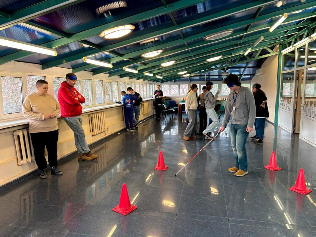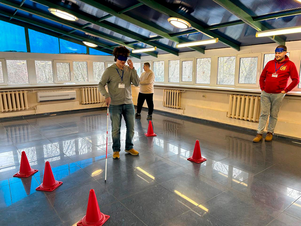 В рамках этого мастер-класса учащиеся надевали маски на глаза и с помощью белой трости пытались обойти препятствия. Они ощутили, как меняется пространство вокруг, как трудно становится ориентироваться.
