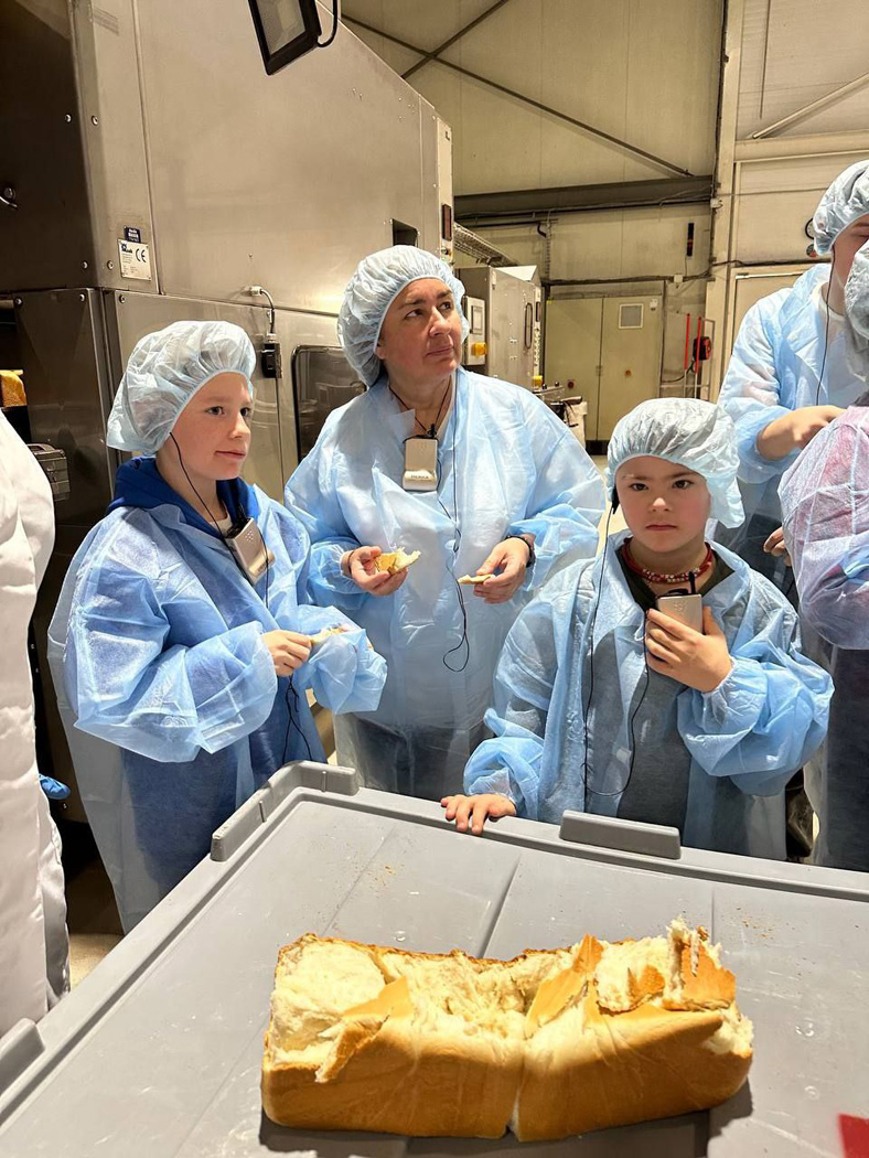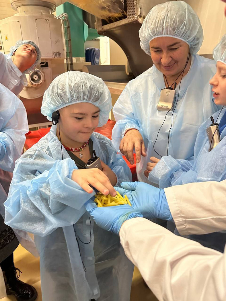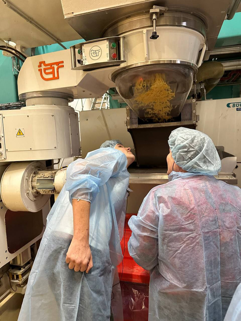 Вдохновившись собственноручно приготовленным обедом, группа отправилась на экскурсию по производству. Это была уникальная возможность увидеть, как изготавливают те самые макароны, которые они только что с таким успехом приготовили. Ребята наблюдали за работой современных линий, где из отборной пшеницы и воды замешивается тесто, которое затем формуется в знакомые всем спагетти, пенне и фарфалле, и бережно сушится, сохраняя свой вкус и пользу.