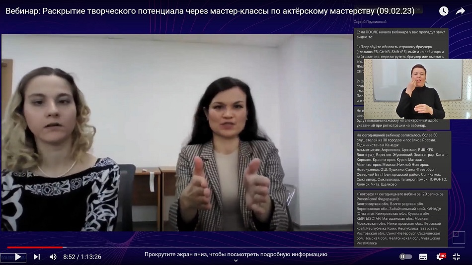 Практическая польза вебинара, состоит в том, что многих слушателей очень интересовал вопрос – где можно пройти курсы по актёрскому мастерству? Мы обсудили, какие есть возможности для прохождения подростками с инвалидностью мастер-классов по актёрскому мастерству, и теперь они знают, где могут «прокачивать» свои навыки, реализовывать себя в актёрском искусстве.