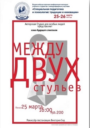 Её пригласили в Московский педагогический государственный университет в качестве спикера и режиссёра: Виктории нужно было не только рассказать про работу с людьми с особенностями развития, но и показать спектакль на международной конференции «Специальная педагогика и психология: традиции и инновации». Времени до конференции было совсем немного, и Виктория ходила по различным театрам, где играли люди с особенностями развития, и отбирала актёров для будущего спектакля – нужны были конкретные люди и типажи, поскольку Виктория решила поставить спектакль по произведению Евгения Клюева «Между двух стульев». Герои в «Между двух стульев» – очень разные и необычные, как в «Алисе в стране чудес», но они могут быть сами собой. По сюжету главный герой произведения Пётро-Павел попадает в необычный мир. Виктория задумала показать как человек без инвалидности попадёт в мир людей с особенностями развития, как сначала он будет сбит с толку, не понимая как взаимодействовать и коммуницировать с необычными для него людьми, но в процессе общения поймёт, что неважно насколько один человек отличается от другого человека, что главное – каждый человек может быть собой.