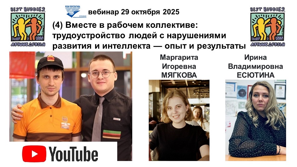 Запись вебинара (и других мероприятий) доступна в группе БФ «Лучшие друзья» ВКонтакте. Если вы или ваша организация хотите присоединиться к программе, то пишите на адреса: margarita@bestbuddies.ru или irina@bestbuddies.ru.