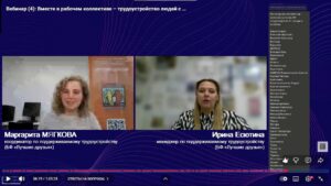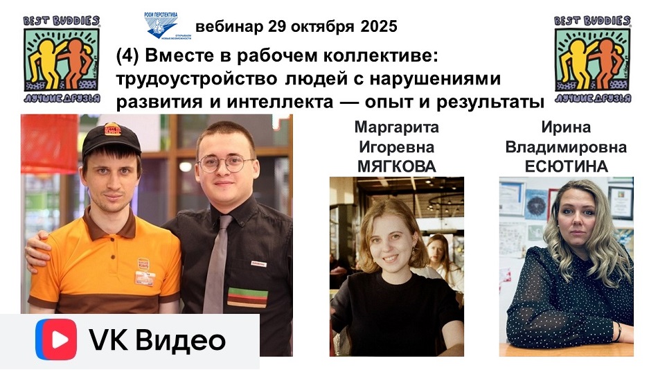 Завершилась серия октябрьских вебинаров от БФ «Лучшие друзья», посвящённая социализации и трудоустройству людей с нарушениями развития и интеллекта. Финальное онлайн-мероприятие на тему «Вместе в рабочем коллективе: трудоустройство людей с нарушениями развития и интеллекта – опыт и результаты фонда «Лучшие друзья» провели сотрудники Фонда – Ирина Есютина и Маргарита Мягкова, работающие в программе поддерживаемого трудоустройства. Они поделились десятилетним опытом поддерживаемого трудоустройства и рассказали, как люди с ментальной инвалидностью становятся ценными и полноправными сотрудниками на открытом рынке труда.