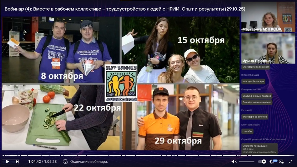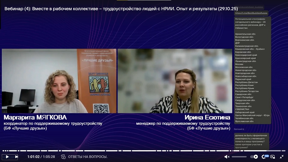 «В ходе нашего вебинара мы рассказали о том, как фонд «Лучшие друзья» уже более 10 лет успешно помогает людям с нарушениями развития и интеллекта находить свое место на открытом рынке труда. Мы обсудили каким образом осуществляется подготовка кандидатов, взаимодействие с работодателями и адаптация рабочих мест. Ответили на вопросы участников вебинара. До новых встреч!»