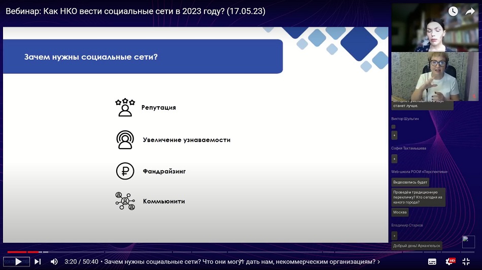 Специалист PR-отдела РООИ «Перспектива» Анастасия Шпынева провела 17 мая вебинар для региональных некоммерческих организаций на тему «Как НКО вести социальные сети в 2023 году: от идеи до реализации».
