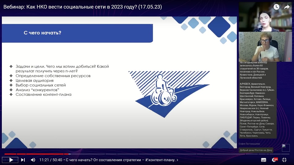 «Конечно, за один час невозможно полностью погрузиться в мир социальных сетей. По запросу коллег из регионов мы постарались рассказать о главных аспектах. Вебинар подойдёт молодым специалистам и тем некоммерческим организациям, кто пока только начинает вести социальные сети. Благодарю все слушателей за внимание!»