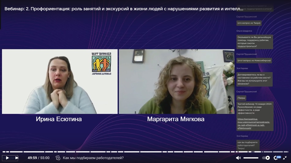 Ирина Есютина и Маргарита Мягкова ответили на все вопросы аудитории, что способствовало более глубокому пониманию представленных материалов и укреплению связи между участниками и организаторами. Вебинар стал важным шагом в повышении осведомлённости о значимости профориентационных занятий и поддерживаемого трудоустройства для людей с нарушениями развития и интеллекта.