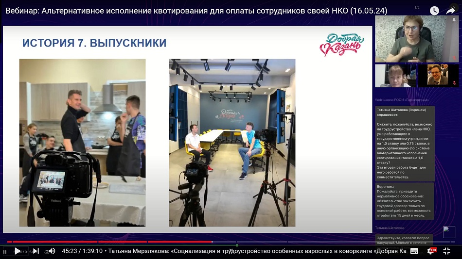 Далее, после ответов на первые вопросы слушателей вебинара из Воронежа и Калининграда, директор АНО «Добрая Казань» Татьяна Мерзлякова рассказала об истории социализации и трудоустройства особенных взрослых в коворкинге «Доброй Казани» – на примере 7 разных «кейсов» трудоустроенных человек (с различными формами инвалидности).