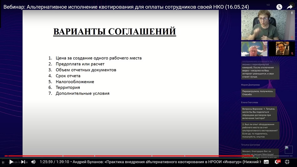 В первой части вебинара Михаил Новиков, руководитель отдела по трудоустройству людей с инвалидностью РООИ «Перспектива», и Вера Глаголева, координатор РООИ «Перспектива» по Воронежской области, осветили основные вопросы, связанные с законодательным регулированием квотирования рабочих мест для людей с инвалидностью, ответственностью за невыполнение правил квотирования, заключением соглашений о трудоустройстве людей с инвалидностью в другой организации, порядке налогообложения для принимающей и направляющей сторон.
